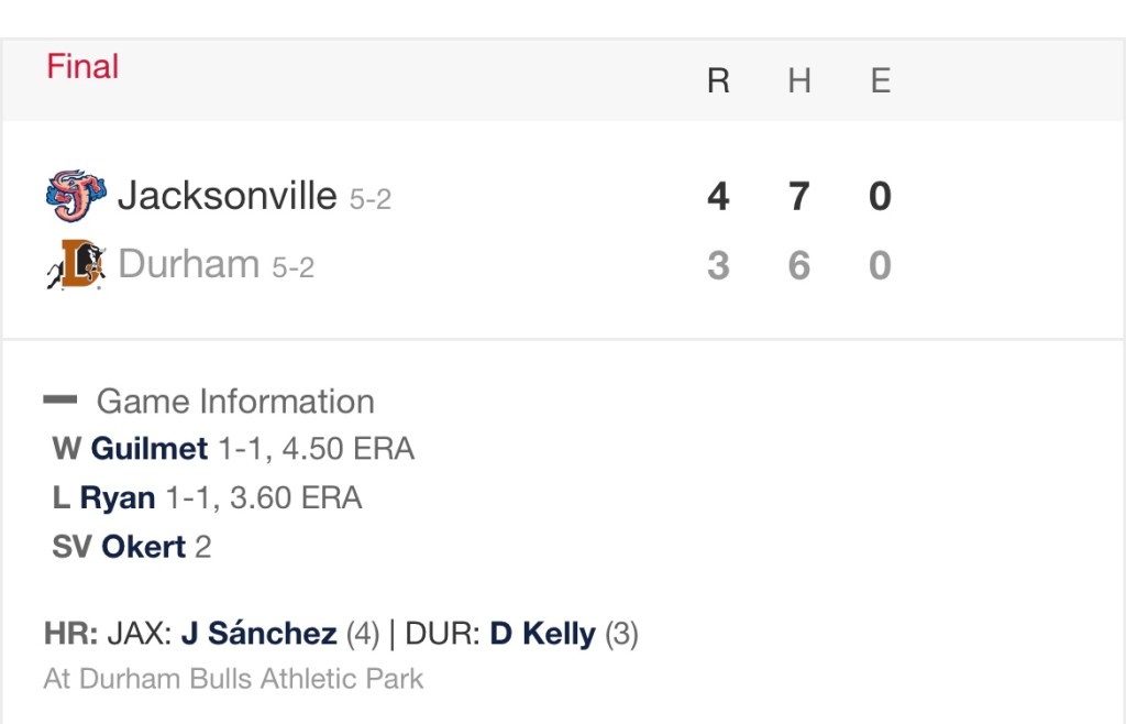 Dalton Kelly led the way for the Bulls with a home run and single. Joe Ryan took the loss for Durham, allowing four runs against five strikeouts over his five innings of work.