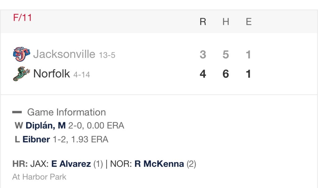 Norfolk’s offense was led by Mason McCoy (who reminds me very much of Adam Eaton) who went 2-for-5 with a triple. Norfolk leads Triple-A East in triples. So there’s that.