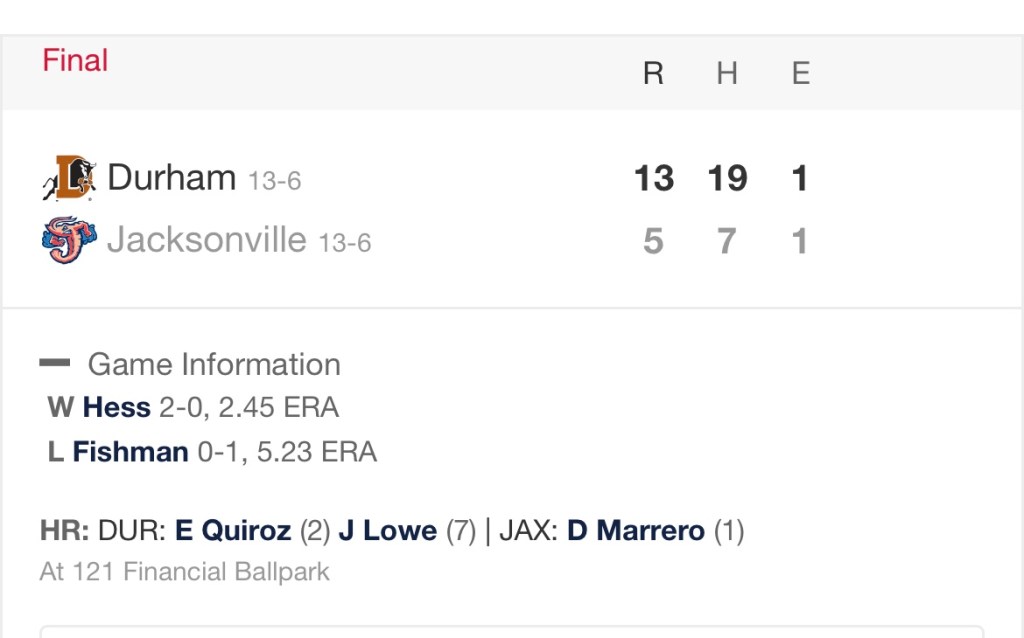 Every man in the Durham lineup tallied at least one hit during the game. All but one scored a run. It was an impressive performance. For the sake of brevity, it’s probably easier for you to read the box score here: https://www.milb.com/app-firstpitch/gameday/bulls-vs-jumbo-shrimp/2021/05/25/647760/final/box