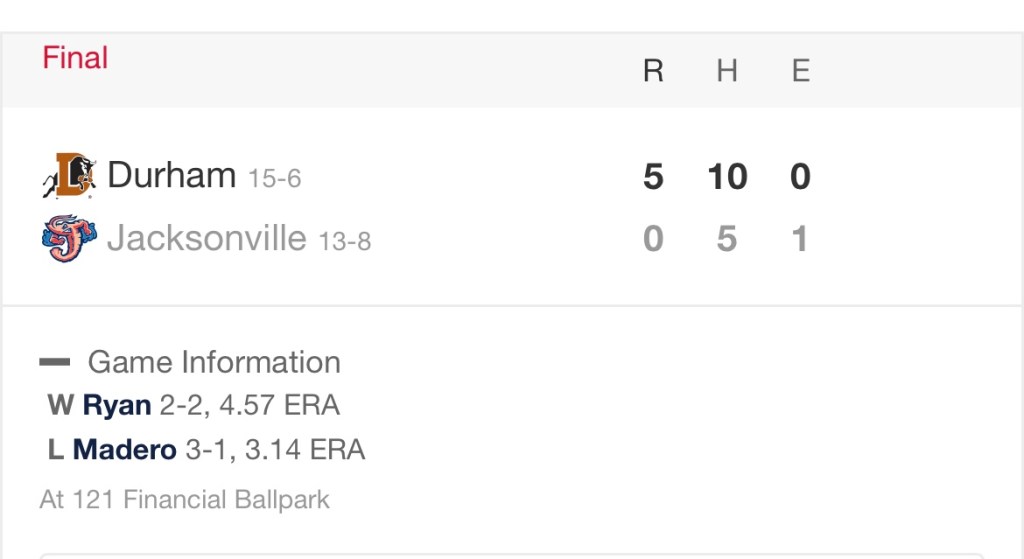The teams go at it once again this evening at 121 Financial Ballpark. First pitch 7:05 pm. The game is a sellout, so listening on 690 ESPN Jax or MiLB.tv are your options if you don’t have tickets.