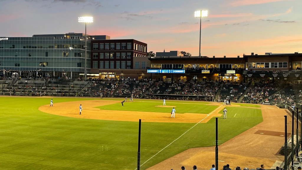 Some of the Fireflies players seemed familiar. After looking through the lineup, I realized that I had seen a couple of these guys when I went to see the Burlington Royals of the rookie-ball Appalachian League back in 2019 – which feels like way, way longer ago than only two years. Anyway, kind of neat to see these guys at the next level. The name that really jumped out was Jake Means, and he had a great game on that fine evening.