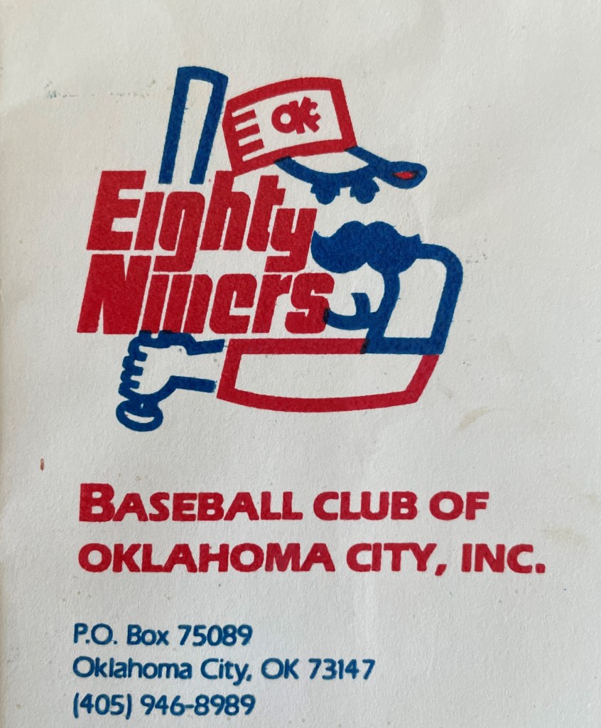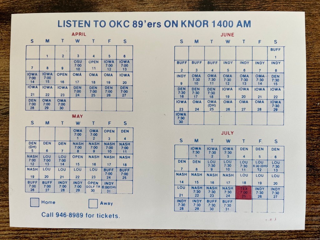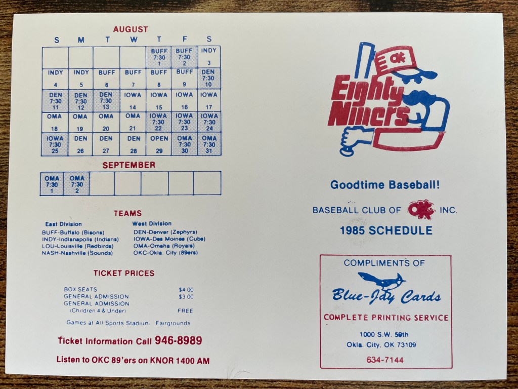 The 1985 version of the 89ers was an affiliate of the Texas Rangers and played in the old American Association, so we see teams that look familiar today to fans of the Triple-A East. Interesting that OKC is the only member of the old American Assoc. to be in the Triple-A West. The Niners sent along a few cool things including this schedule:
