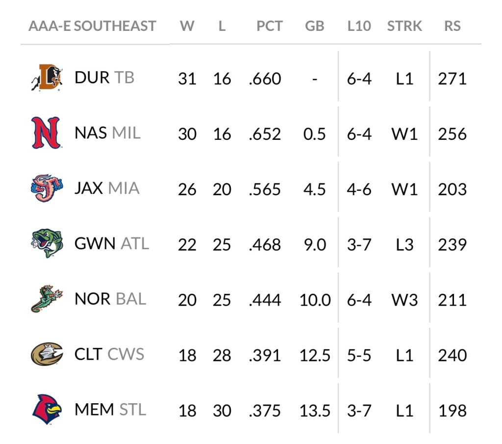 The Jacksonville Jumbo Shrimp ended last week where they began: firmly entrenched in third place. The Shrimp managed to go 3-3 against Durham last week, which meant they stayed 4.5 games back of the Bulls. So literally, the only thing that changed for the Shrimp over the last seven days was that their winning percentage went down by a very small amount. That’s it. Here’s where the Southeast Division currently stands:
