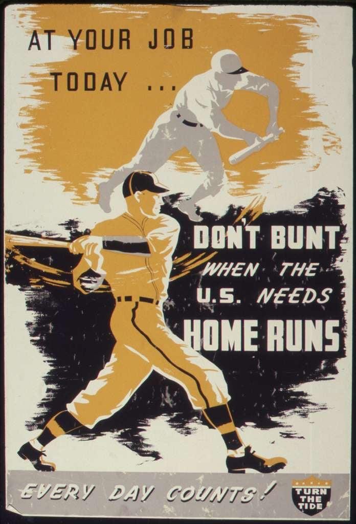 This poster was created by the U.S. War Production Board around 1942-43. Baseball was at its absolute height of popularity during this time. The metaphor used in the poster would have been self-explanatory given the sport’s place in public consciousness. Its very simple message: give your all and work hard to make a difference in the war effort.